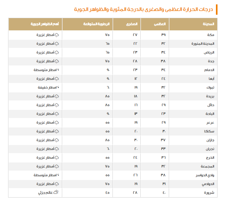 أما سبب الإنذار الأحمر فهي الأمطار الغزيرة التي تصل إلى جريان السيول، والتي ستضرب أيضًا كلًا من الرياض، مكة المكرمة، القصيم، نجران، تبوك، الحدود الشمالية، ومع التنويه على أنها ستصاحبها زخات من البرد مع رياح عالية السرعة تصل حتى 50 كم/ ساعة، وآخر التنويهات جاءت على درجات الحرارة التي لم ترتفع بالقدر الملحوظ حتى الآن وذلك كما يلي: