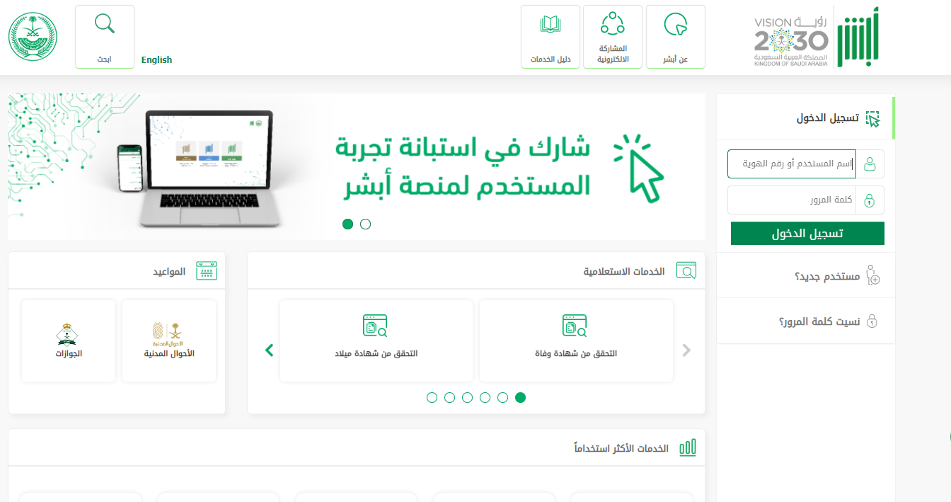 - الذهاب إلى الموقع الإلكتروني الرسمي لمنصة أبشر " من هنا ".