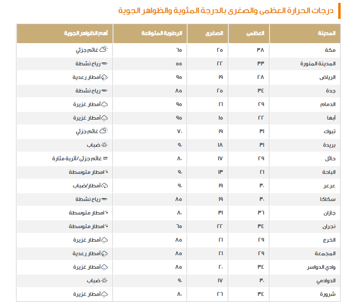 عمل المركز الوطني للأرصاد بالإعلان عن طبيعة حالة الطقس اليوم في السعودية الخميس 2 مايو 2024؛ والذي كشف عن ابتعادها تمامًا عن وضع الاستقرار سواءً على مستوى درجات الحرارة، الرياح وحتى الأمطار؛ إذ أوضح أن الحرارة في حيز الانخفاض في مختلف المناطق وذلك ما يتضح من الجدول الآتي: