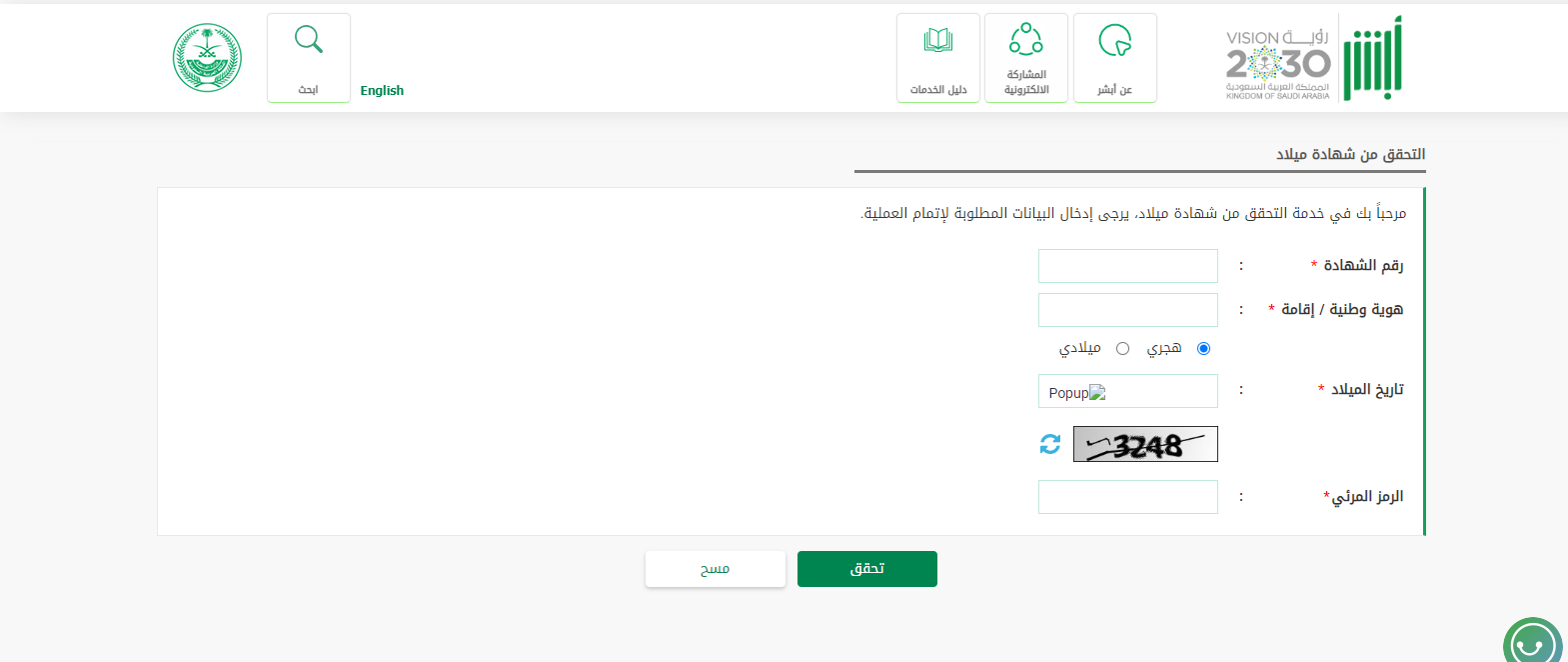 - اختيار خدمة التحقق من شهادة الميلاد.