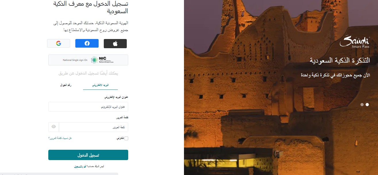 - قم بالنقر على أيقونة "تسجيل الدخول"، ثم املأ البيانات الخاصة بالتسجيل، أو قم بالدخول من خلال منصة النفاذ الموحد، ويمكنك أن تقوم بإنشاء حساب جديد مع إدخال البيانات المطلوبة.