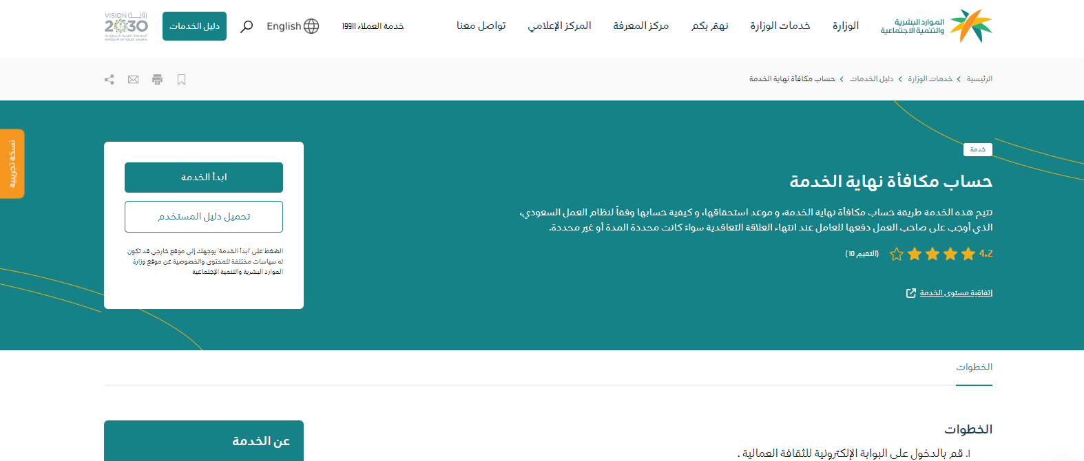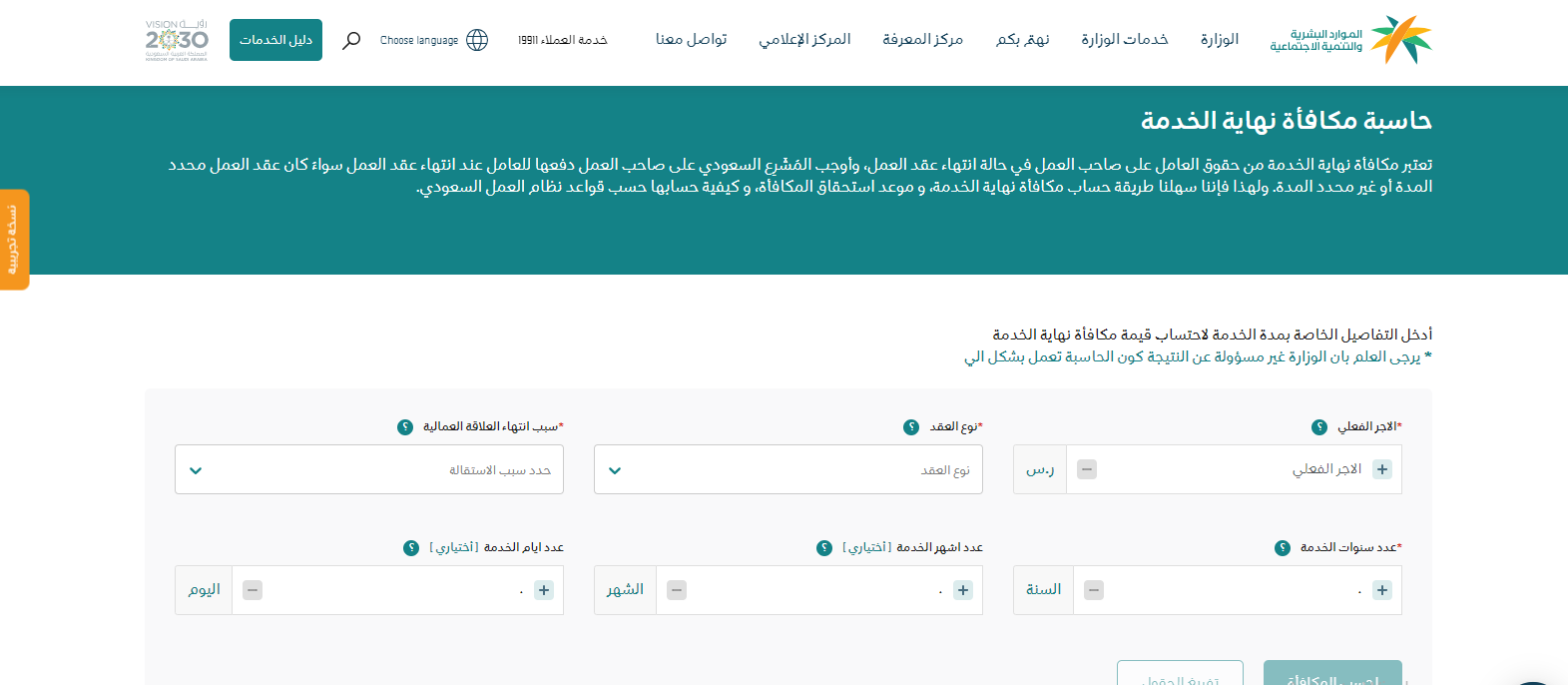 - الدخول إلى الموقع الرسمي الخاص بحاسبة مكافأة نهاية الخدمة، من هنا.