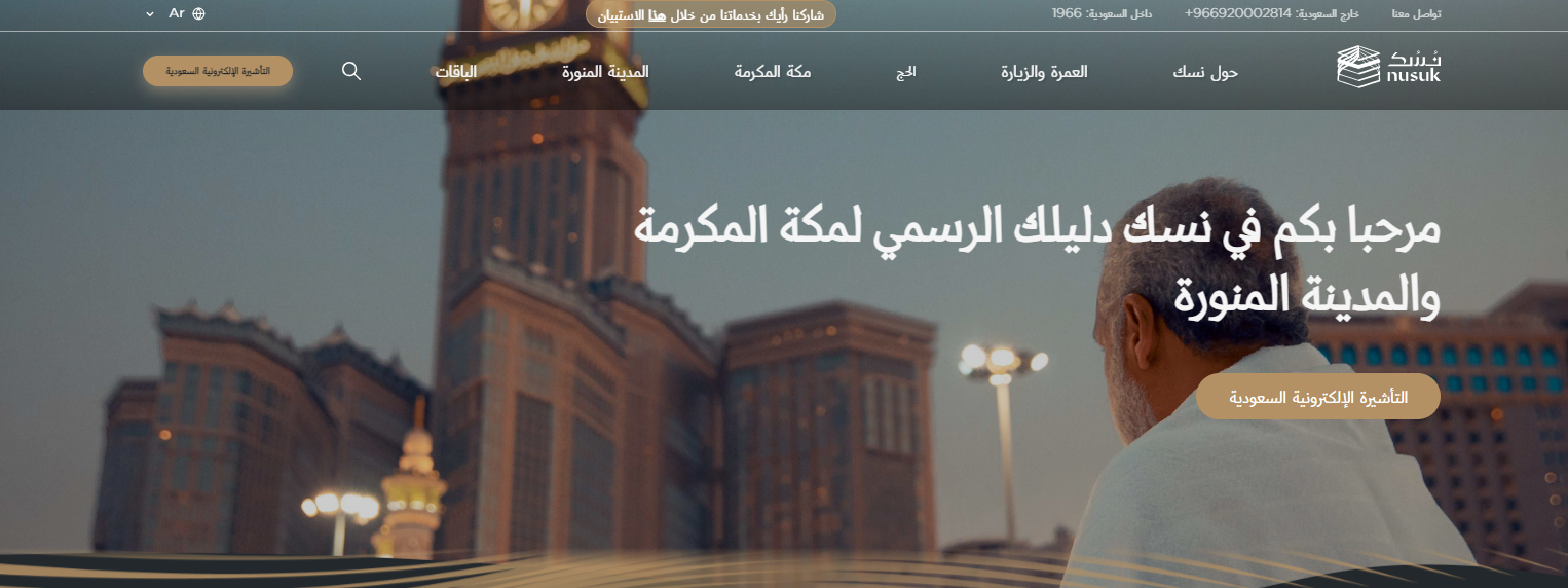 يمكنك أن تقوم بالتقديم على إصدار تصريح للحج لعام 1445 من خلال منصة نسك الإلكترونية نت كافة أنحاء العالم، ولكي تستطيع التقديم يمكنك أن تقوم بتتبع الخطوات التالية: