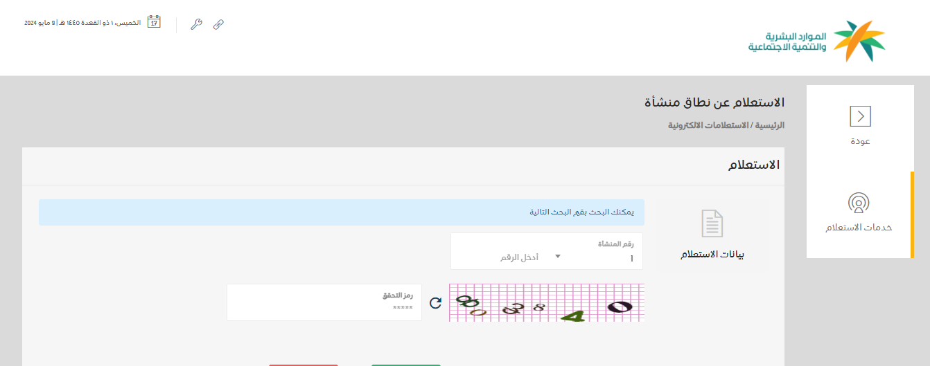 - اختيار خدمة الاستعلام عن نطاق المنشأة.