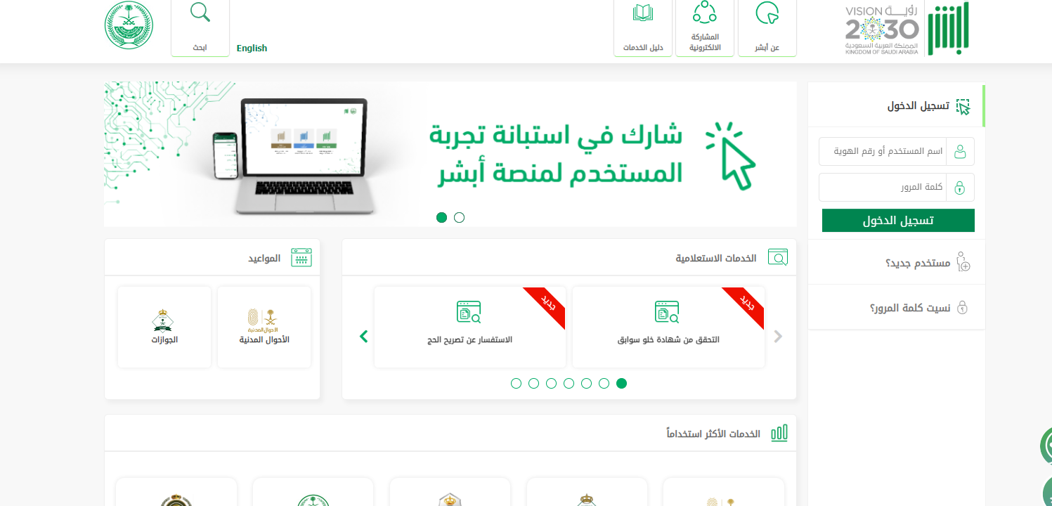 - التوجه إلى الموقع افلكتروني الرسمي لمنصة أبشر " من هنا ".