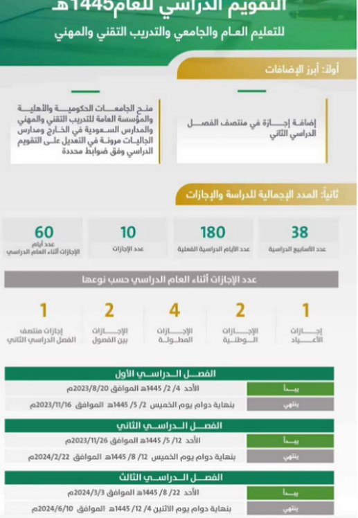 أن العام الدراسي الجديد سيبدأ يومي 18 أغسطس لعام 2024 الموافق ليوم الاثنين، أي 14 صفر 1446ه، كما أنها أوضحت أن العاغم الدراسي سينتهي 10 يونيو 2025م، الموافق ليوم الاثين 4 من ذي الحجة 1446 ه، أمت بالنسبة لعام 2025 لم يتم إصدار التقويم الدراسي، وسنوفيكم بالأخبار في حالة صدور أي تجديدات بالنسبة للمواعيد.