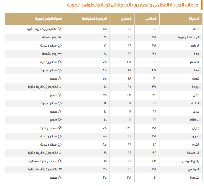 هذا مع التشديد من أن زخات البرد ستكون هي الأخرى مصاحبة للأمطار، وكل ذلك سوف تشهده مناطق عدة مثل؛ المنطقة الشرقية، مكة المكرمة، عسير، الباحة، جازان، الرياض، المدينة المنورة وتبوك، بالإضافة إلى ذلك تبين أن سكان تلك المدن وغيرها عليهم توخي الحذر من الانخفاض في درجات الحرارة الذي يأتي كما يلي: