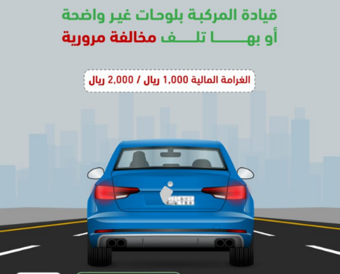 نظام المخالفات المرورية والعقوبات من ضمن أهم الأنظمة التي تم الإعلان عنها من الإدارة العامة للمرور السعودي، ومن أهم تلك العناصر التي تشتمل عليها هي عنصر السير بلوحة غير واضحة للسيارة مما يؤدي إلى دفع غرامة مالية، حيث تتراوح رسوم عقوبة السير بمركبة بلوحة تالفة: بين ألف ريال سعودي إلى 2000 ريال.