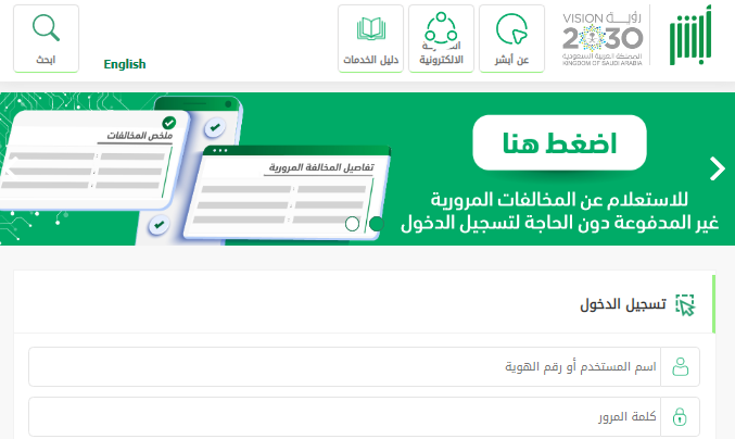 - اختر اضغط هنا للاستعلام عن المخالفات المرورية غير المدفوعة دون الحاجة لتسجيل الدخول.