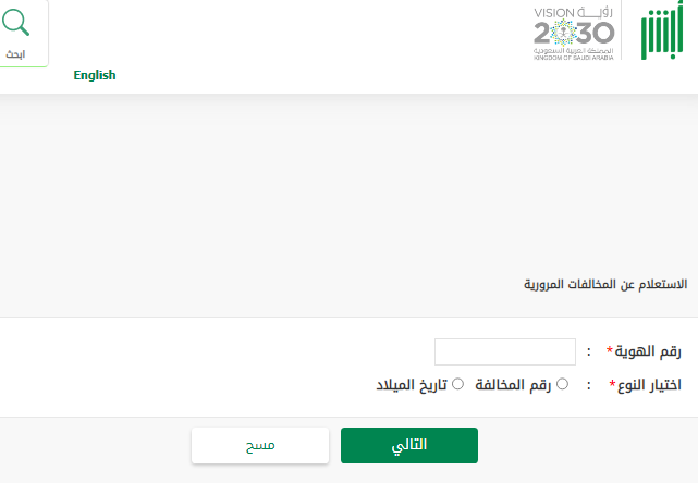- من ثم يمكن تحديد نوع استعلام آخر من الخيارات التالية: رقم المخالفة، أو تاريخ الميلاد.