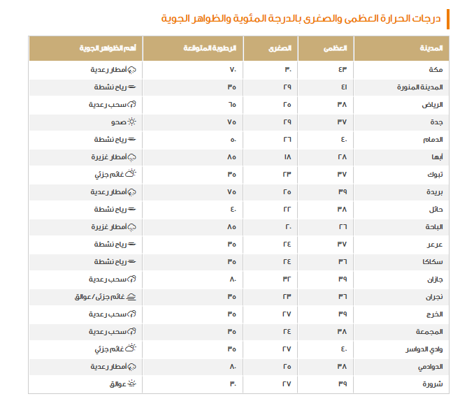 في ذات البيان تم التأكيد على أن الرياح النشطة لا تزال سيدة الموقف حتى الآن والتي تصل سرعتها إلى 50 كم/ ساعة، ومن ثم وجب الحذر من الغبار والأتربة المثارة بواسطتها، أخيرًا تم الكشف عن درجات الحرارة في السعودية اليوم والتي جاءت على النحو التالي: