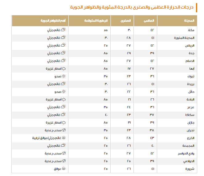 على صعيدٍ آخر تم تشديد التحذير لأهالي عسير، الباحة، جازان ومرتفعات في مكة المكرمة من الأمطار الرعدية التي تصل شدتها إلى الغزارة وهذا ما دعا الأرصاد إلى إعلانها الإنذار الأحمر، أما درجات الحرارة التي تعتبر هي الحديث الرائج في المملكة الآن فسوف نعرض تفاصيلها على النحو التالي: