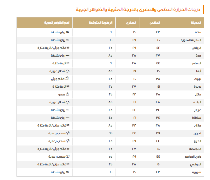 يُذكر أيضًا أن من بين ما ورد في بيان الأرصاد صباح اليوم هي درجات الحرارة في السعودية والتي جاءت في كل منطقة على النحو التالي: