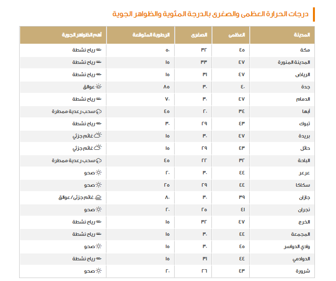 كذلك في إطار طرح مستجدات حالة الطقس في السعودية الجمعة تطرقت الأرصاد السعودية إلى الموجة الحارة التي بدأت منذ أيامٍ قليلة؛ حيث أشارت إلى أن تأثيرها لا يزال مستمر على عدد من المناطق وعلى رأسها؛ القصيم، الرياض، المنطقة الشرقية، المدينة المنورة ومكة المكرمة وفيما يلي عرض شامل لدرجات الحرارة: