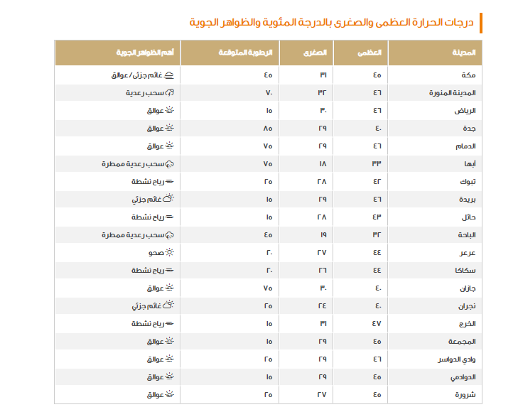 خرج المركز الوطني للأرصاد اليوم السبت الموافق 8 يونيو 2024 ببيان رسمي يفيد بحالة الطقس اليوم في السعودية، وهو ما ذكر فيه أنه من الضروري توخي الحذر بالأخص في مكة المكرمة، المنطقة الشرقية، الرياض، القصيم والمدينة المنورة وذلك بسبب الطقس الحار إلى شديد الحرارة لاستمرار الموجة الحارة إلى الآن، وفيما يلي كشف عام عن الدرجات المرصودة: