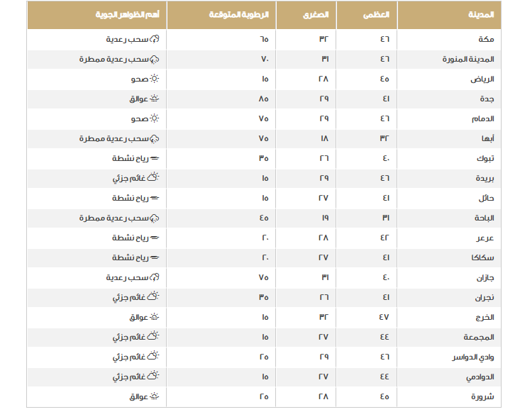 جدير بالذكر أن المركز الوطني للأرصاد الذي قام بنشر الدرجات السابقة في إطار عرض حالة الطقس في السعودية هو ما أكد على أنه يجدر بالجميع ضرورة الحذر من الموجة الحارة بالتأكيد من خلال عدم التعرض للشمس مباشرة مع الإكثار من شرب السوائل.