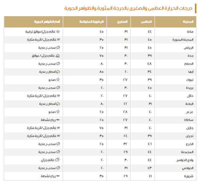 في حين أنها قد عملت على التنويه أيضًا من الأمطار الرعدية التي تجتاح عسير، مكة المكرمة، جازان والباحة، مع ملاحظة فرص تكون السحب الرعدية في القصيم، وأخيرًا الطقس يكون شديد الحرارة أو حار على الرياض والمنطقة الشرقية وفيما يلي عرض لتلك الدرجات: