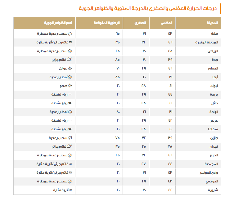 في هذا السياق تمت الإشارة أيضًا إلى أن الأمطار تم تسجيل عودتها لتسقط على نفس المناطق السابق بشدة خفيفة ومتوسطة بل ووصلت إلى حدّ الغزارة على كلٍ من مكة المكرمة، الباحة وعسير، وجاءت من ضمن التنويهات درجات الحرارة التي هي في ارتفاع نسبي نعرضها بالتفصيل على النحو التالي: