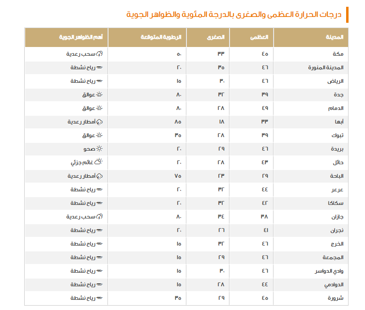 بينما الحرارة فهي ارتفاع متواصل مسببة طقس يغلب عليه الحرارة الشديدة على أغلب أنحاء المملكة، وفيما يلي نوضح درجات الحرارة في السعودية اليوم: