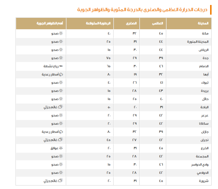 في هذا السياق يُذكر أن الأرصاد قد نوهت على منطقتي عسير وجازان بأنهما تتعرضان إلى وجود فرص هطول للأمطار الرعدية، هذا مع التنويه عليهما بالإضافة إلى المنطقة الشرقية ومكة المكرمة من الرياح عالية السرعة التي تصل إلى 50 كم/ ساعة.