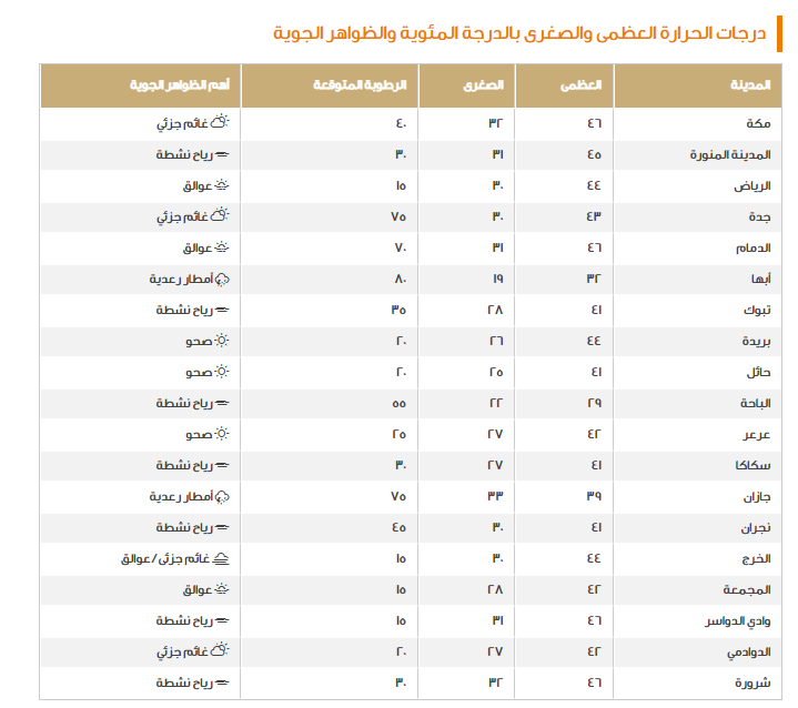 إذ تم التنويه على أن تلك الرياح تزيد شدتها لتصل إلى 50 كم/ ساعة على الرغم من أنها في العادة ستتراوح بين 12 – 45 كم/ ساعة، كما تمت الإشارة إلى الأمطار التي توجد فرص قوية لهطولها في كلٍ عسير وجازان، ومع إطلاق تحذير للمنطقة الشرقية من الموجة الحارة وعليه نستعرض باقة الدرجات العظمى والصغرى لكل مدينة على النحو التالي: