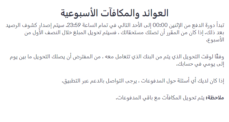 إذ إنها أشارت إلى أن العوائد والمكافآت الأسبوعية يتم دفعها في دورة تبدأ من يوم الإثنين الساعة الثانية عشر من منتصف الليل حتى يوم الأحد الذي يليه إلى الساعة الـ 11:59 مساءً، حيث يتم إصدار كشف رصيد ومن ثم في حال استحقاق السائق أي أموال سيتم تحويل المبلغ أثناء النصف الأول من الأسبوع.