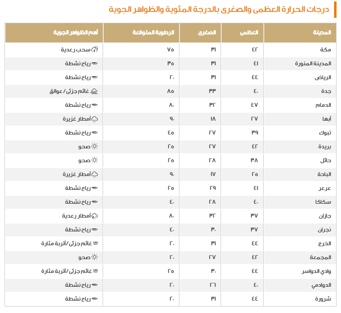 ذلك مع التنويه العاجل من الرياح الهوجاء التي تم رصد سرعتها اليوم تصل إلى 60 كم/ ساعة وهي ما تتسبب في انطلاق العواصف الترابية على كلٍ من المدينة المنورة، الرياض، المنطقة الشرقية مما يؤدي إلى التسبب في انعدام الرؤية الأفقية بما يصل إلى الطريق بين الساحل الجنوبي وجازان.