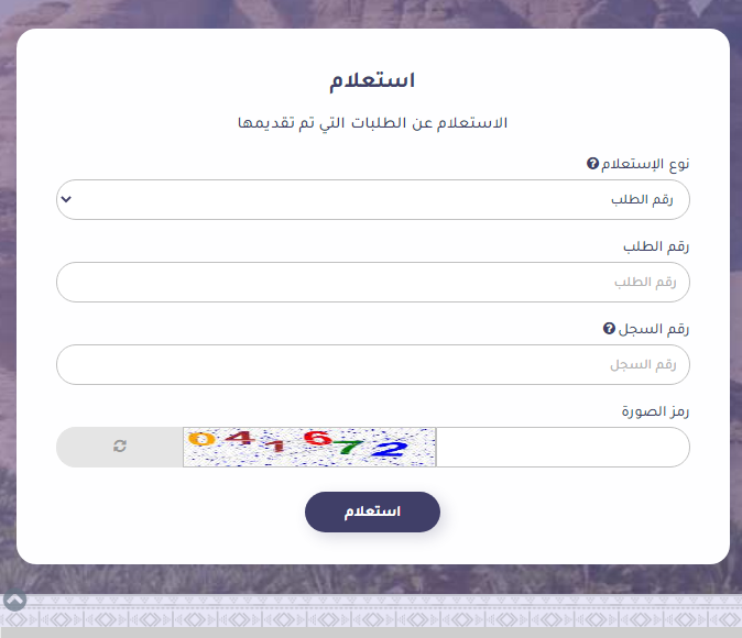 - قم بتعبئة بيانات الاستعلام: رقم السجل، ورقم الطلب.