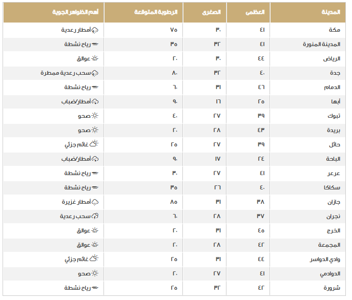 كذلك تم التنويه على أن العواصف الترابية سوف تضرب كلًا من نجران، الرياض والمنطقة الشرقية بفعل الرياح، مع ضرورة توخي الحذر من الموجة الحارة التي ستشهدها بعض المناطق في المملكة وفيما يلي نستعرض درجات الحرارة كالتالي: