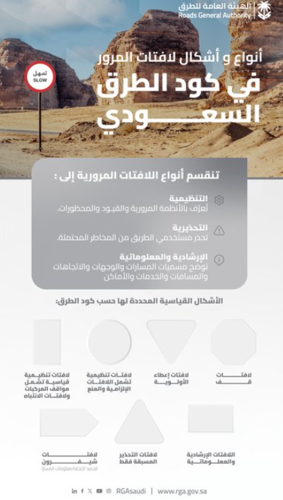 حسب كود الطرق السعودي | تعرف على مدلولات لافتات المرور من الهيئة العامة للطرق