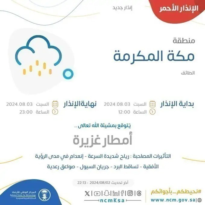 كما تم إصدار إنذار أحمر لخمس مناطق هي مكة، عسير، جازان، الباحة، ونجران، حيث يتوقع أن تشهد هذه المناطق أمطارًا غزيرة وسيول وصواعق رعدية وزيادة في سرعة الرياح حتى الساعة الثامنة من مساء اليوم.