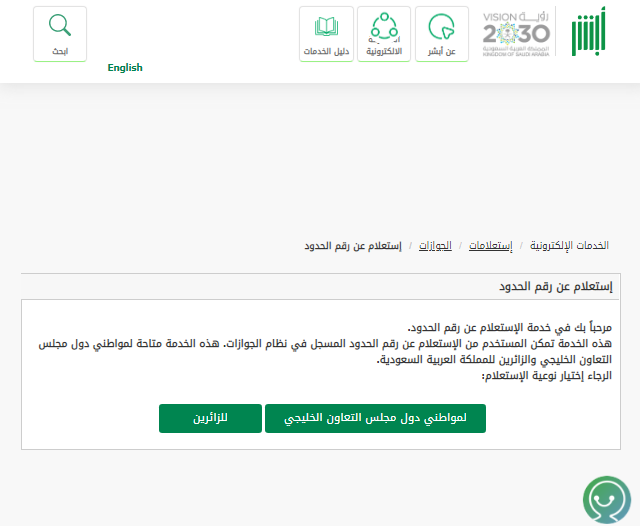 يوجد الكثير من الخدمات التي يمكن الحصول عليها بشكل إلكتروني بكل بساطة فقط عن طريق ما توفره منصة أبشر للأفراد في السعودية، ومن ضمنها خدمة التأكد من بيان رقم الحدود لمواطني دول مجلس التعاون الخليجي حيث يتم استخدامها مباشرةً فقط عن طريق الدخول إلى رابط مباشر للاستعلام عن رقم الحدود برقم جواز السفر.