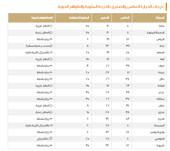 كذلك تمت الإشارة إلى أن العواصف الترابية التي ستهب على كلٍ من الرياض، الجوف، تبوك، الحدود الشمالية والمنطقة الشرقية، وأخيرًا تم التنويه على أن درجات الحرارة لا تزال في ارتفاع بمثل ما هو موضح أدناه: