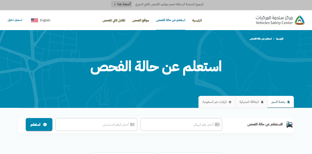 توفر منصة سلامة المركبات السعودية آلية التحقق من بيانات الفحص الدوري التي تمت على السيارة، ويتم القيام بذلك فقط عن طريق تتبع خطوات الاستعلام عن الفحص الدوري: