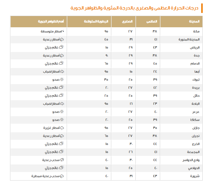 ذلك مع تكرار التحذير من العواصف الترابية التي تتكون بفعل الرياح النشطة بسرعة تصل إلى 60 كم/ ساعة، مع وجود احتمالات لتكوّن الضباب على نفس المناطق السابقة، وأما بالنسبة إلى الطقس العام فهو يميل إلى الحرارة خاصةً في المناطق الشرقية التي نعرض درجاتها على النحو الآتي: