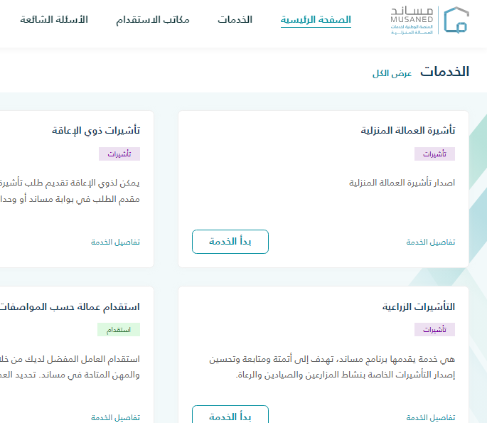 - النقر فوق بدأ الخدمة من أيقونة إصدار تأشيرة العمالة المنزلية.