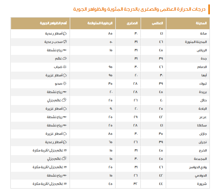 على صعيدٍ آخر تم التنويه على ان الرياح مستمر نشاطها في الزيادة حتى بلغت سرعتها 60 كم/ ساعة متسببة في هبوب عواصف من الغبار والأتربة على ذات المناطق السابق ذكرها، وأخيرًا تمت الإشارة إلى أن درجات الحرارة مرتفعة على أغلب أنحاء المملكة وهذا ما نبينه بالتفصيل عبر الجدول الآتي: