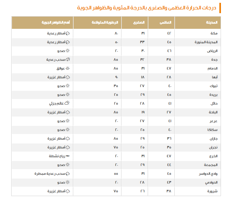 هذا وقد تم التنويه بشدة على أن الضباب الكثيف سوف تشهده سماء الرياض، المدينة المنورة والمنطقة الشرقية وغيرهم وعليه كان من الضروري توخي الحذر، أما درجات الحرارة فهي لا تزال مرتفعة بالشكل الموضح أدناه: