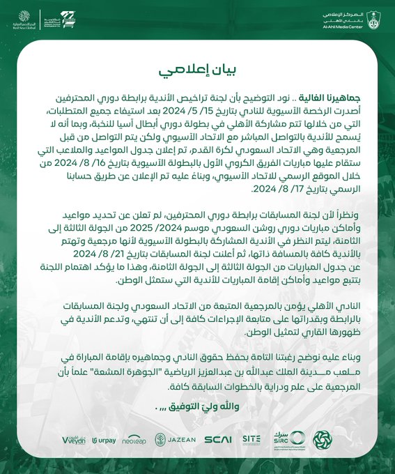 إذ أخيرًا وبعد طول صمت أمام موجات التصريحات من الجهات غير المعنية قرر النادي الأهلي السعودي بكسر هذا الصمت ببيانٍ رسمي عاجل عبر حسابه الإلكتروني؛ وهو ما أورد فيه كافة التفاصيل التي دارت بشكلٍ أساسي حول كونه لم يكن يحق له التواصل المباشر مع الاتحاد الآسيوي وذلك لأنه من مهام المرجعية وهي الاتحاد السعودي لكرة القدم، ومن هنا استكمل بيانه كالتالي: