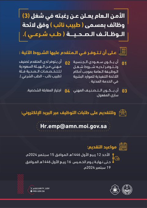 في واحد من البيانات الرسمية العاجلة التي قام الأمن العام السعودي بإطلاقه على الحسابات الرسمية الخاصة به قد تم الكشف عن طرح باقة من الوظائف لديها؛ وهي ما تبين أنها تتبع القطاع الصحي بعدد 3 فرص.