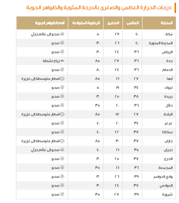 استكملت الأرصاد السعودية بيانها موضحة طبيعة درجات الحرارة اليوم وهي ما تبين منها أن التراجع بدأت يطغى عليها، وهي ما نعرضها عبر الجدول التالي: