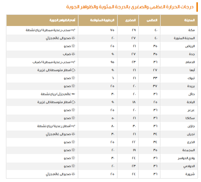 أما فيما يخص درجات الحرارة في السعودية اليوم فقد اتضح من بيان الأرصاد أنها لا تزال تتراوح في الثلاثينيات عدا المدينة المنورة ومكة المكرمة هما وصلت فيهما الحرارة إلى 40؛ وفيما يلي عرض شامل لها: