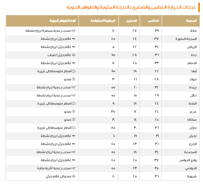 في هذا الصدد تبين في البداية أن الأمطار الرعدية لا تزال فرص هطولها مهيئة في مكة المكرمة، عسير، جازان والباحة؛ حيث إنها تسقط بشدة غزيرة وتصاحبها زخات من البرد مع الرياح النشطة سطحيًا بسرعة تصل إلى 50 كم/ ساعة.