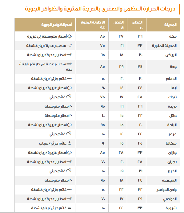 أيضًا تم توجيه الأنظار إلى أن كلًا من؛ القصيم، تبوك، الحدود الشمالية، الرياض، نجران، حائل والمنطقة الشرقية يتعرضون إلى فرص كبيرة لهطول الأمطار ما بين الخفيفة إلى المتوسطة.