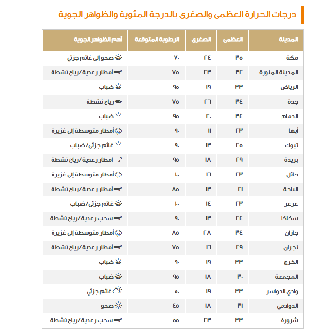 ليأتي تحذير آخر من زخات البرد والرياح التي تنشط على المستوى السطحي لتزداد سرعتها عن 60 كم/ ساعة مما تؤدي إلى إثارة الأتربة والغبار، وأما ما يدور حول درجات الحرارة فقد تم التنويه على أنها في حالة من التراجع النسبي وهذا ما سيتم توضحيه عبر الجدول التالي: